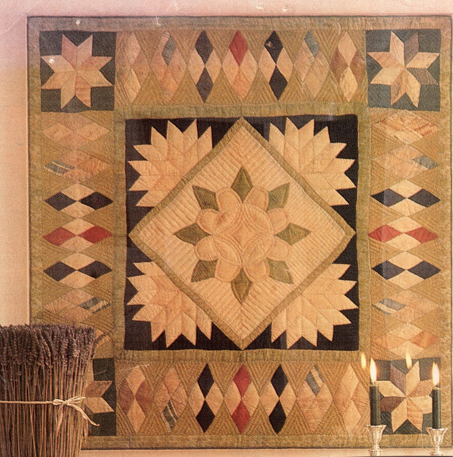 This quilt is based roughly on a pattern by Lisa DeBee Schiller published in McCall's Quilting magazine, October 2004. I recognized Lisa's pattern as being based on an antique silk crib quilt called "Framed Medallion" published in Country Living's Country Quilts, Hearst Books, 1992. Here is a picture of the Framed Medallion from the book.