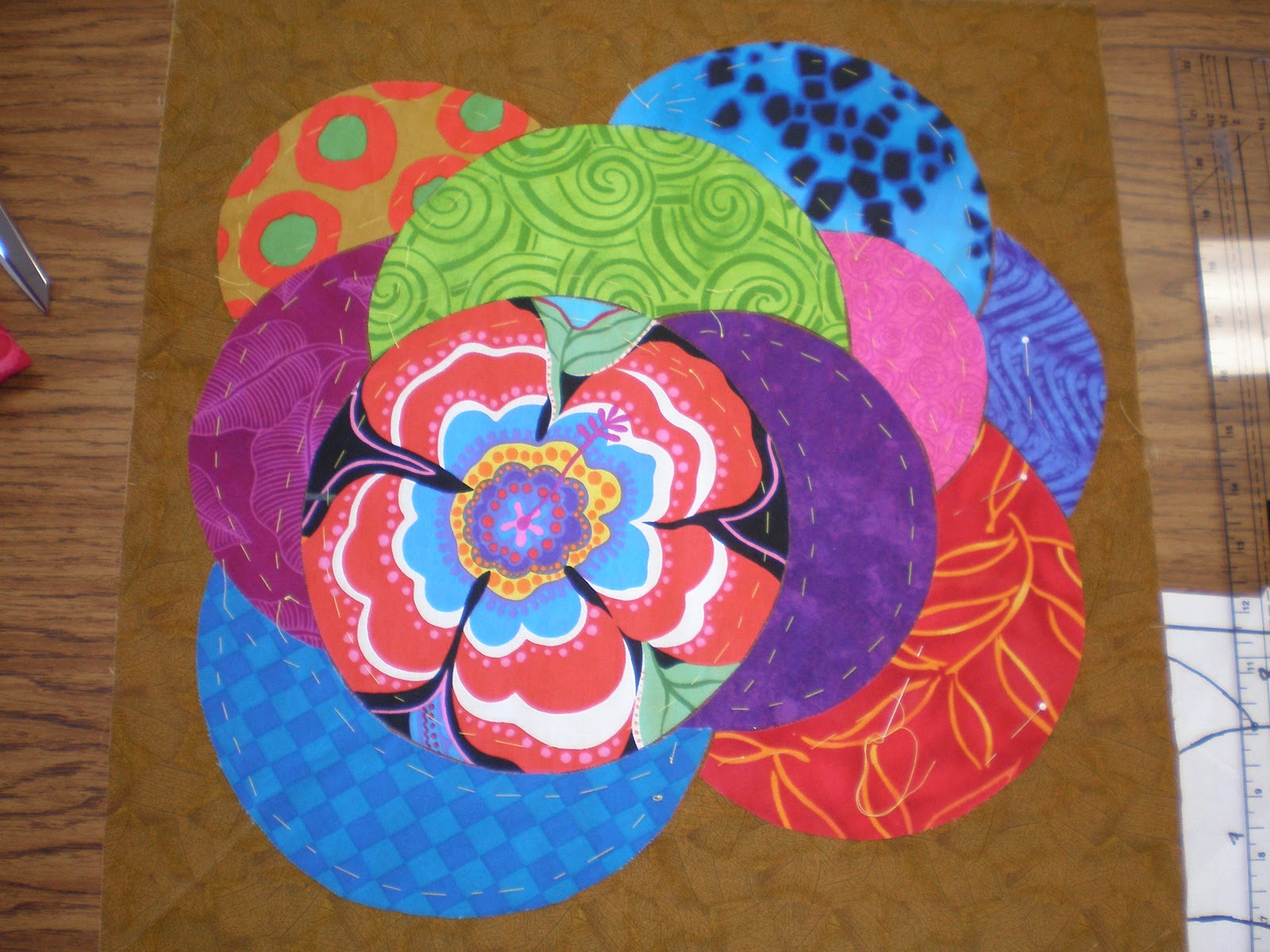 This student finished her block because she brought her machine and used machine applique technique rather than the needle-turn hand applique that I teach. She, as did the student above, chose not to include the four corner pieces of the block which allows the circles to "float" on the background fabric. I love the Kaffe Fassett stripes.